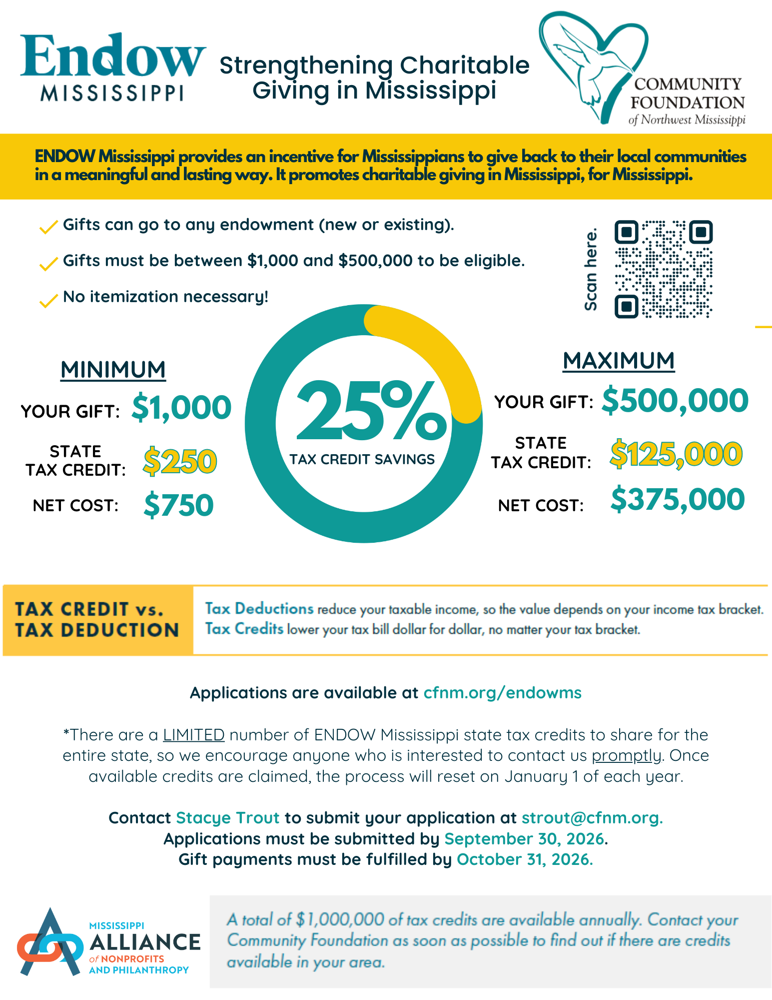 ENDOW Mississippi is a state tax credit program to encourage individuals, businesses, and organizations to make lasting investments in their local communities through charitable giving. It was created in 2019 by the state Legislature to support gifts to permanent endowments only at qualified community foundations, like the Community Foundation of Northwest Mississippi!